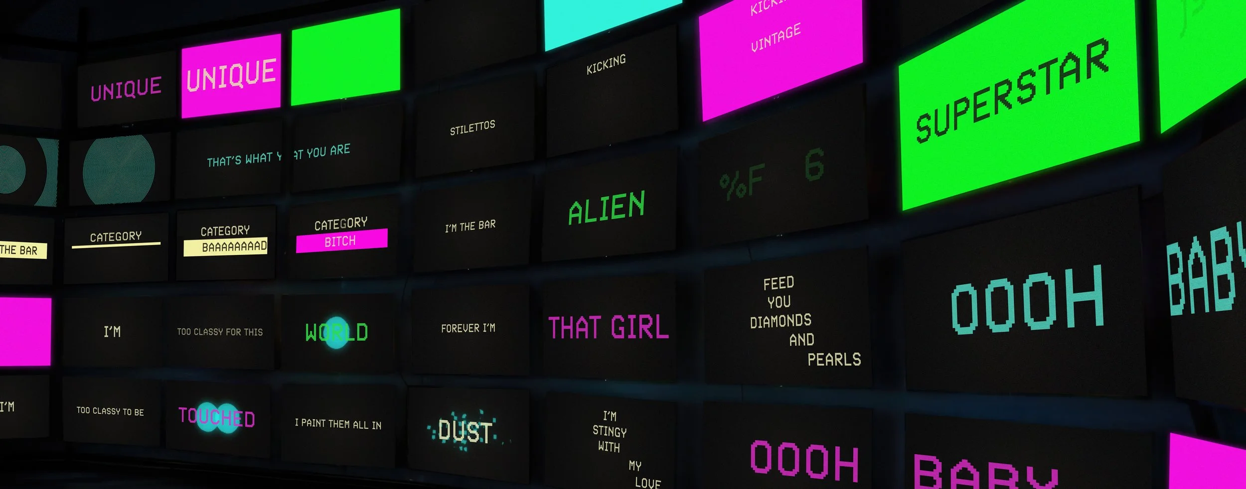 Inspired by the opening set design of Beyoncé’s Renaissance World Tour and the song’s introductory troubleshoot test, the lyric video uses a pixelated monospaced font with bright flashing colors of pink, green, and cyan to catch viewer attention and mimic a system malfunction. These bright flashing colors reiterate the bold and unapologetic lyrics, specifically the word “UNIQUE,” which is a major through line repeated in the song.