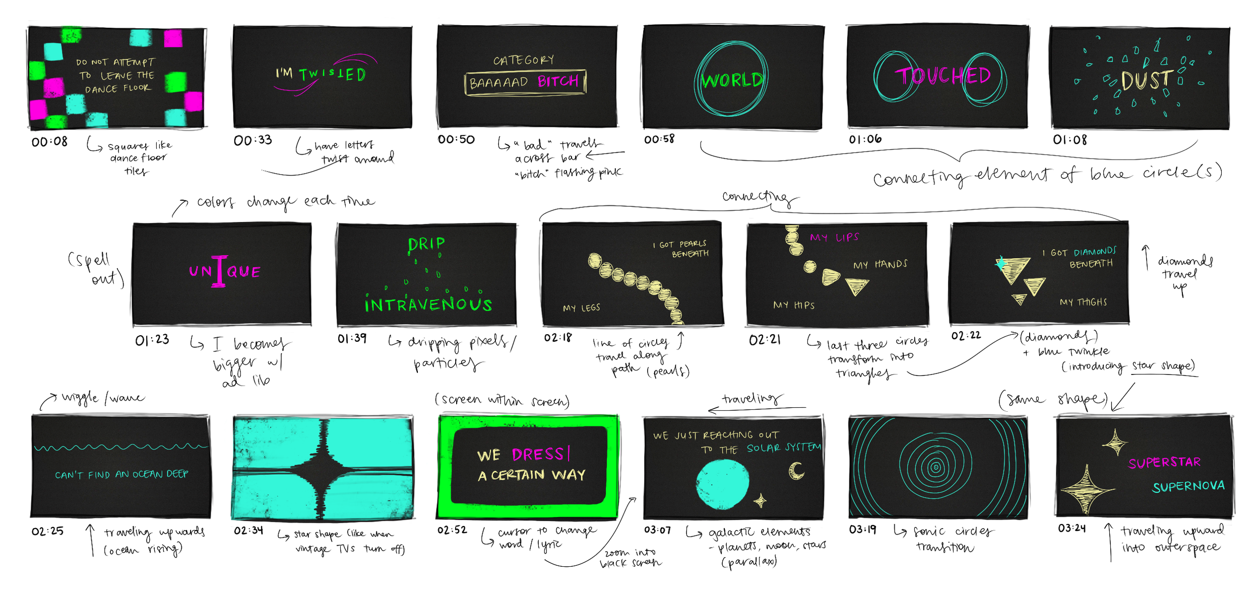 Another notable example can be seen in the bridge when pearls travel across the screen but transition into diamond shapes. These connecting elements work together to express a cohesive aesthetic and provide a literal depiction of the lyrics on the screen.