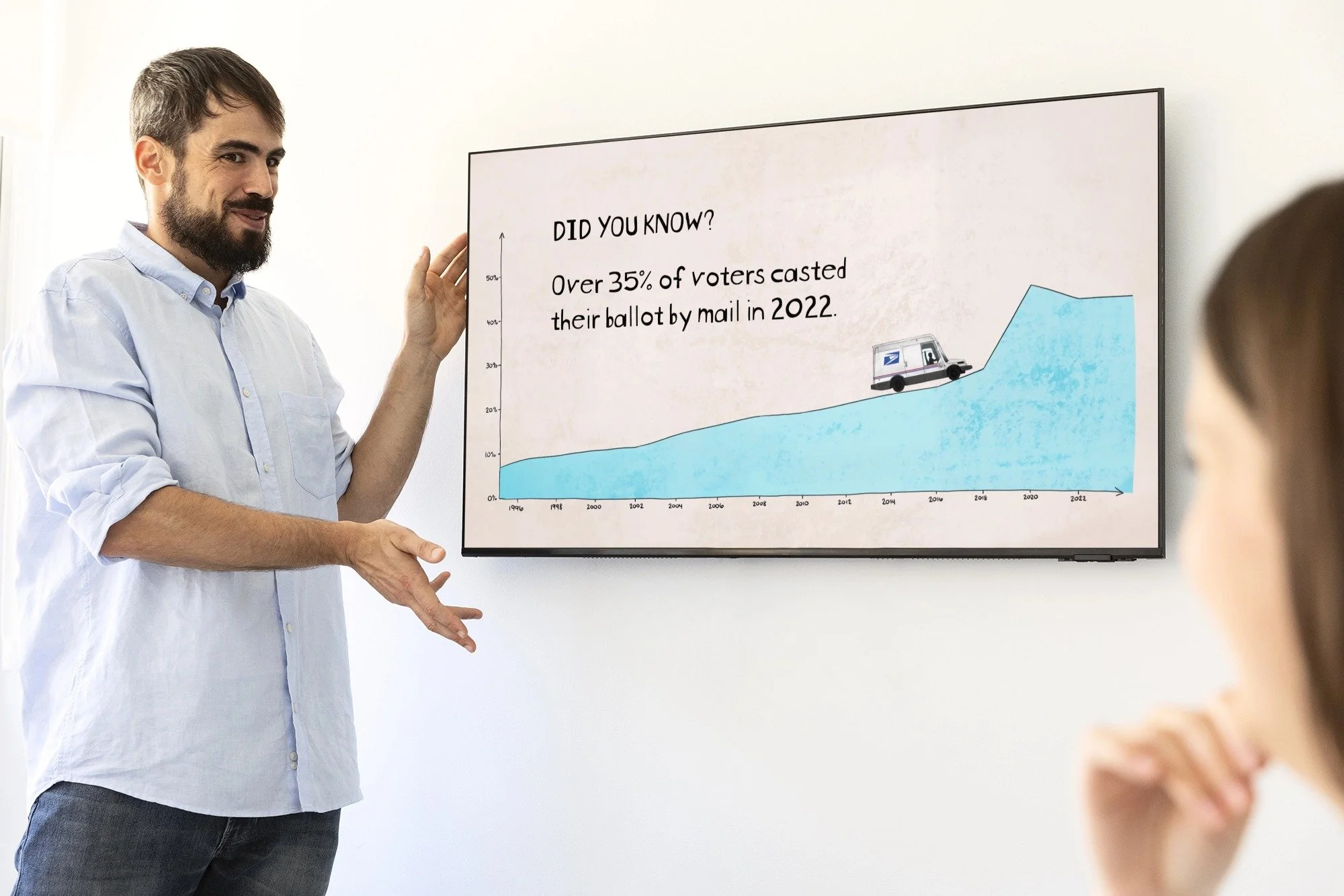 Vote by Mail is a data driven campaign presented in a way that strikes a perfect balance between professionalism and lightheartedness. The campaign persuades viewers to vote by mail based on reputable data sourced from Pew Research and the U.S. Census Bureau. The video acknowledges the benefits of voting by mail and informs the audience on how to check the status of their ballot.